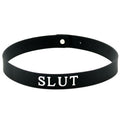 Black silicone adjustable collar. The word SLUT is written on the front of the collar in white letters.