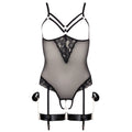 Transparent, revealing and extremely seductive! Open cup body with suspender straps. The body is made out of powernet and lace with metal details and wet look accessories. There is a removable, stimulating chain, snap hooks over the otherwise open crotch area. The bra straps are adjustable. The suspender straps are adjustable and removable. The removable handcuffs are attached to the thigh straps with short chains, snap hooks. The handcuffs and thigh straps have hook and loop fasteners. Black. 90% polyamide, 10% spandex wet look 92% polyester, 8% spandex.
