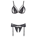 3-piece suspender set with seductive floral lace. The bra has adjustable straps, a captivating strap design in the cleavage area and cups with cheeky slits accentuated by a small decorative ring. The included suspender belt is narrowly cut and has adjustable suspender straps. Both lingerie pieces have a clip fastener at the back for easy on and off. The completely crotchless string adds the finishing touch to this ensemble.