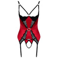 Demi cup cami suspenders and a crotchless thong from Cottelli LINGERIE in a set. Made of stretchy red satin and adorned with delicate lace and contrasting elements in black. Super soft and stretchy for high comfort. The incorporated balcony bra is padded and puts the breasts in the limelight and is perfectly framed and supported by the cups straps and underwire. Shimmering rhinestone rings between the cups and at the front of the waistband complete the package. The straps and suspenders are very elastic and can be adjusted to fit. The back of the cami suspenders features a row of hook fasteners and the matching thong is invitingly open in the crotch. 90% polyamide, 10% spandex. Stockings not included. Demi cup cami suspenders and crotchless thong in a set Silky stretch satin and delicate lace A seductive colour scheme of red and black Padded balcony bra Adjustable cup straps Shimmering rhinestone rings at the front Accentuating waistband only at the front Adjustable straps and suspenders Inviting crotchless thong Soft and stretchy for high comfort The colour of love in satin and lace!