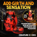Become the wolf of your partners dreams with this Hell Hound sleeve and ball stretcher! It fits over your shaft, adding pressure to your rod, while also wrapping around your balls and stretching them! Made out of premium, phthalate-free, body-safe silicone, it is best used only with water-based lubricants only. Enhance your playtime and the sensations by giving yourself a rod that gets thicker by adding these two bulging, wolf-knots at the base! It stays in place due to the ball stretcher wrapped around your family jewels, and essentially tugs your balls every time your partner goes deep! Enjoy adding this to your kinky cosplay and fantasy roleplay while indulging with your partner! After use, wash it with warm water and mild soap, then rinse it off and spray it with a toy cleaner. Pat dry and store in a cool, dark place. Measurements Overall length 3.5 inches. Ball ring 1.2 inches inner diameter. Cock ring 1.1 inches inner diameter, 2.6 inches outer diameter (adds 1.6 inches in girth). Materials Silicone Key Features Fantasy Sheath This red and black sheath has canine knots that bulge at the base, and a strap that wraps around the balls. Ball Stretching Give your balls a tug that stretches them, enhances sensation, and increases endurance! Adds Girth! Add girth to that rod of yours and give your partner a thick shaft to ride! Premium Silicone Made out of premium, phthalate-free, body-safe silicone.