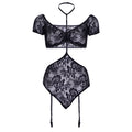 2 Piece Lace bandeau top with cuff sleeves and halter harness garter teddy. Intricate lace, daring halter harness, and sexy garter straps will make this your new favorite lingerie set. Hand wash cold, Do not bleach, Drip dry, Do not iron