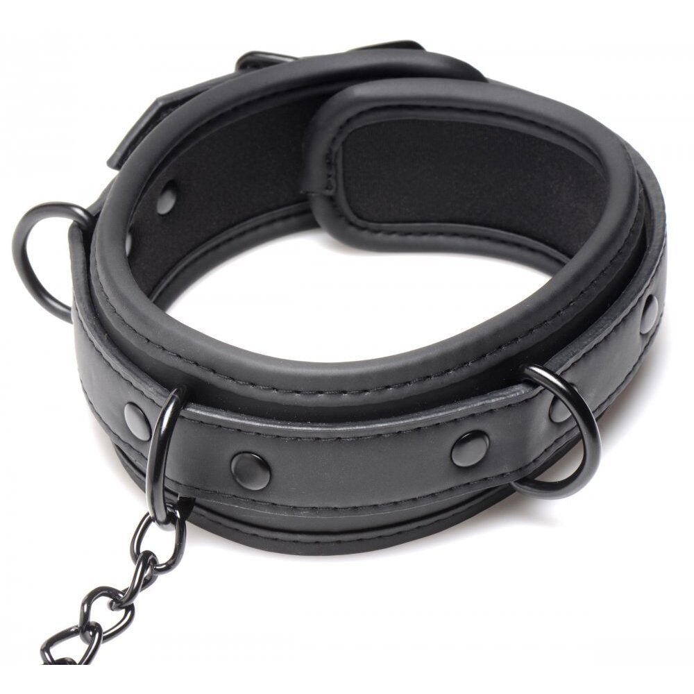 Enjoy turning your submissive lover into a Collared Temptress with this neoprene collar with black chains connected to adjustable nipple clamps! The collar itself has black buckles for a fully adjustable fit and 3 D-rings to attach accessories or chains and restraints to. The center D-ring has black chains already connected that split into two chains, each with a nipple clamp at the end. Each nipple clamp has a rubber tip to protect the sensitive skin tissue and a small screw for precise pressure adjustments. All metal is nickel-free. Have your lover kneel in front of you as you place their collar around their neck. The buckles clasp and you make sure the collar fits snug and comfortably so they can feel the gentle, padded and smooth texture of the neoprene. You take the chain at the center of their throat and pull them gently towards you, making them lift their chest. Taking their nipple in your free hand, you take the clamp and place it slowly behind the nipple, on the areola, and adjust the pressure using the small screw. Doing the same on the other nipple, you hear your lovers breath catch in their throat and gasp as they begin to mingle pain and pleasure, experiencing it all at your hands. To clean, simply spray with a toy clean and wipe dry. Measurements. The collar adjusts from 12.5 to 15.75 Inches. Chain 22 Inches. Nipple Clamps open to 0.5 inch wide.