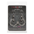 Includes 2 fully adjustable nipple adornments. Soft and comfortable cinch design. Sturdy high-quality chain for added sensuality. Non-piercing, non-tarnishing, nickel-free. Nickel-Free Iron, chain, beads. Silicone, loops. Onyx, jewels.