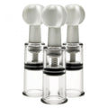 Enjoy powerful suction with this triple set of demurely sized suction cylinders. Just apply to any area that would benefit from increased sensitivity and blood flow, no pumps or accessories needed. These self-contained suction devices work with a simple twist. Silent, simple, and discreet, these suckers can be taken and used practically anyway for on the go stimulation. Lubed internally for smooth movement and a strong seal that makes for sublimely powerful suction. Measurements Opening is 0.75 inches in diameter, the tube is 2.35 long and the entire item is 4 inches long.