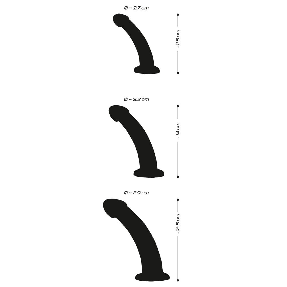 Dildo trio for anal pleasure and stretching training. 3-piece anal dildo set with different sizes and weights, Small dildo, total length 11.5 cm, insertion length 10.3 cm, diameter 2.7 cm, weight 59 g. Dildo medium total length 14 cm, insertion length 12.6 cm, diameter 3.3 cm, weight 104 g. Dildo large total length 16.5 cm, insertion length 15 cm, diameter 3.9 cm, weight 154 g. Each transparent dildo is ideally curved and extremely flexible with pronounced glans and a strong suction cup.